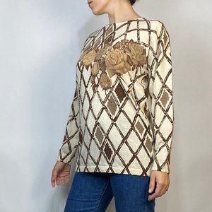 Vintage 80s Wool & ANGORA Sweater with ROSE and Check Pattern! Medium