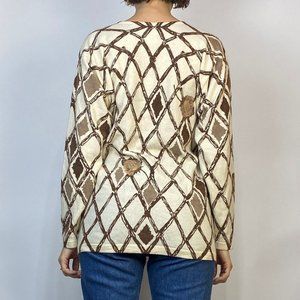 Vintage 1980s long slim sweater in delicate wool angora blend with fence like print with roses, leaves and grapes at the center! So decadent! Also has beaded details here and there. By L'Ultima Designer Collection.