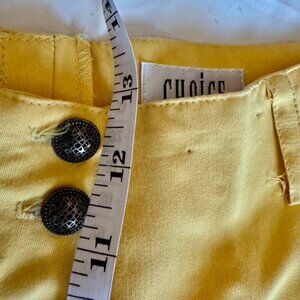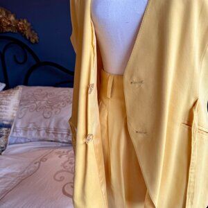 Vintage 1980s yellow vest and pants set, vintage size EU 36 US CA 8, fits like a modern size 4. Great used condition. Buttoned with tie side front relaxed fit vest, high waisted pleated straight leg pants. From Choice by Stillman, made in Germany, seems to be a sample set. Has a couple small puncture marks from probably tags in pants as shown in photo 14. Cat friendly, nonsmoking home.
