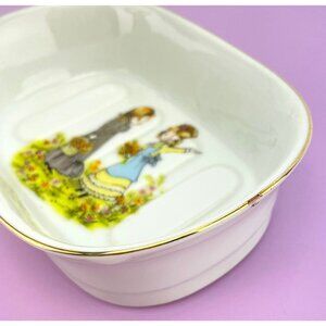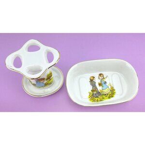 Adorable set of 2 pieces bathroom set, porcelain, made in Japan. Price is for the set and includes a toothbrush holder and a soap holder, print of a little girl holding a basket of fruits.