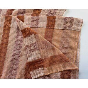 Beige, rust and brown vertical stripes, in a groovy pattern, the material is a semi-sheer mesh.