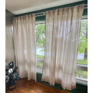 Cream/almond colored background, with tan stripes and brown zigzag-herringbone pattern. Each panel has great weight and drapes well. Would be perfect in a living room or dining room!
