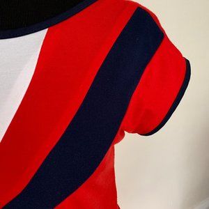 Awesome blue, red and white vintage 1980s dress. Midi length. Very good vintage condition. Unlined. Stretchy waist.