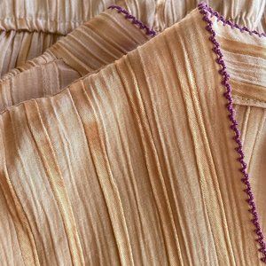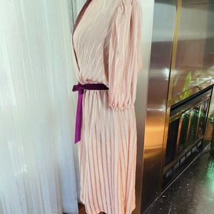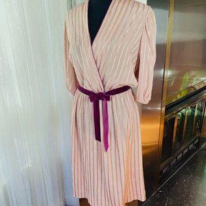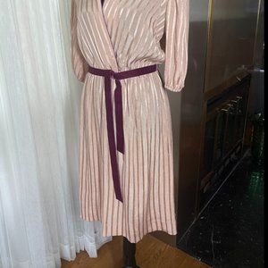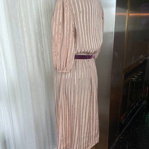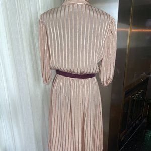 80s A-Line dress, gorgeous rose gold ribbed material with raspberry colored trim and ribbon. Made by Leslie Fay. Elastic wrist and waist; belt tie is velvet ribbon.