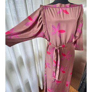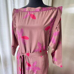 Vintage 80s mauve maxi dress, with vibrant pink floral print, it has dolman/batwing sleeves and a relaxed column silhouette. Designed with a boat neckline that extends to the tip of the shoulders, it gives a slightly boxy silhouette. Includes a matching self-tie belt for optional waist definition. Pull-over style with no closures. Length is ankle. Label indicates made in Canada by Mahogany, material is 100% polyester.