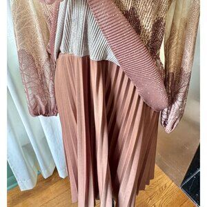 Vintage 80s dress, taupe, dusty mauve, beige nature pattern, pleated skirt