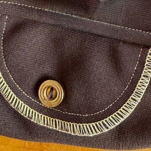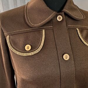Gorgeous 80s jacket. Chocolate brown with wide yellow decorative stitches on the front faux pockets and bottom hem. It is not really thick so could be worn as a blouse. It is meant to be a bit of a loose fit. Material is unknown, likely polyester. It has no stretch.