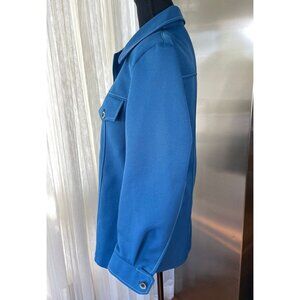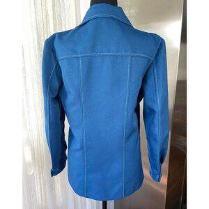 Gorgeous 80s blue jacket. Made for men by Day's sportswear, it is gender neutral as it can easily be worn by anyone. Details are so typically early 80s: white stitching, large lapels, pointed pocket flap. Fabric is very likely synthetic blend, most likely polyester.