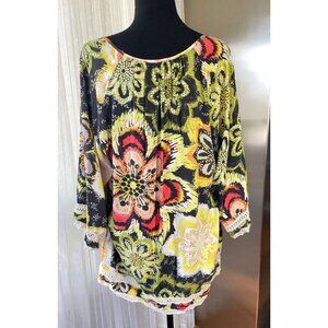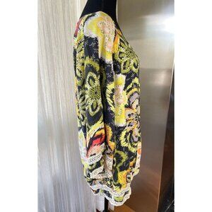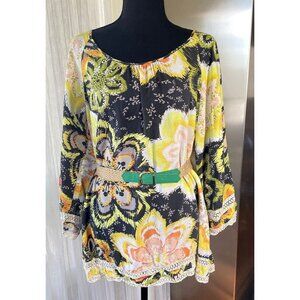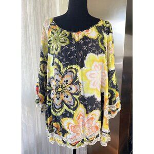 Adorable 80s oversized blouse. Extra wide boat collar, long bell sleeves. Yellow/lime green, with black and orange/coral accents, very large flowers pattern with two rows of lace at the bottom and on the sleeves.
