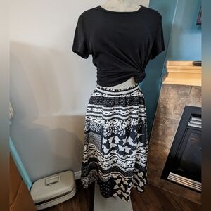 Vintage 80s maxi skirt, untagged, vintage Size M, Crafted of light flowing synthetic material, Fully lined black and white patterned maxi-skirt with contrast panels. Elastic Waist band is in good working order. Overall in excellent preloved condition.
