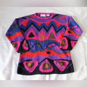 This vintage Segrets sweater is a total standout! Hand-knit with bold geometric patterns and vibrant prints