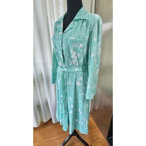 Vintage 1980s shirtdress, by Sears Canada. Mint green with white large flowers, it pockets on the bust, buttons on the front. It has a matching sewn-in belt and long sleeves. Knee length, open collar it is perfect for the office or a casual weekend outfit.