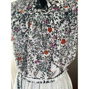 Perfect vintage 80s summer dress, by Joyce Palmer. Keyhole neckline with drawstrings, top has full pattern of tiny flowers while the skirt is showing the pattern growing towards the top in an ombre pattern. Elastic waist, with assorted belt. Colors are off white / ivory, flowers are red with green leaves and vines. Material is likely synthetic/cotton blend.