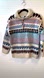 This cozy pullover features a thick, chunky knit in a classic Fair Isle pattern with pastel stripes of pink, teal, blue, cream, and black.
