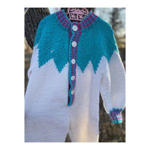 Thick chunky hand knit romper with long legs and sleeves. 1/2 button up front closure. White base with turquoise "icicle" pattern to shoulders and purple accents to collar and cuffs. No stains, holes or tears. Pet and smoke free home.