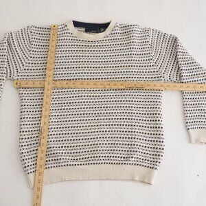 Vintage ’90s Bill Blass White & Navy 3D Eclectic Cotton Grandpa Crewneck Sweater—a bold and timeless statement piece for vintage lovers. Crafted from **100% cotton**, this sweater features a unique **textured 3D knit pattern**, adding depth and character to its classic grandpa aesthetic. The white and navy color combination offers a versatile, effortlessly stylish look.