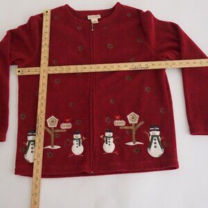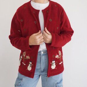 Vintage '90S Carroll Reed Maroon Embroidered Winter Snowman Zip Up Sweater L