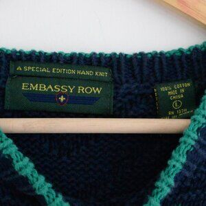 Add a touch of vintage elegance to your wardrobe with this **Vintage '90s Embassy Row Special Edition Hand-Knit Navy and Green Argyle 3D Pattern Crew Neck Sweater (Large)**. Featuring a stunning **hand-knit argyle design**, this sweater combines intricate detailing with the nostalgic charm of a classic '90s piece.