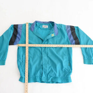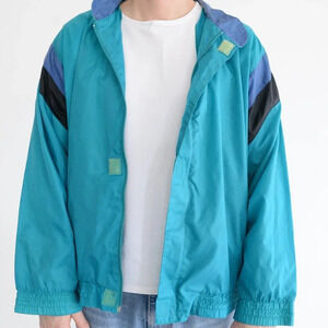 Featuring a vibrant teal and blue color scheme, this windbreaker exudes vintage flair and personality. The zip-up closure adds convenience and versatility, while the lightweight fabric provides protection from the elements without weighing you down.
