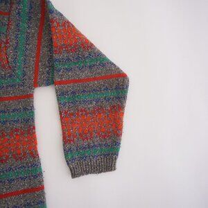 Bring subtle ’90s flair to your closet with this vintage Lizwear grey knit mockneck sweater, featuring pops of red and green woven into a cozy cotton blend. The structured mockneck adds a polished touch, while the retro color palette keeps it playful and seasonal—perfect for fall into winter layering with nostalgic vibes.