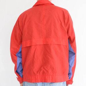 Featuring a bold red and purple color combination, this windbreaker exudes vintage flair and personality. The zip-up closure adds convenience and ease of wear, while the lightweight fabric provides protection from the elements without weighing you down.