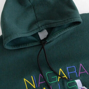 Crafted from soft and durable materials, this sweatshirt offers both comfort and longevity, making it perfect for everyday wear. The rich green color is both eye-catching and versatile, ensuring it pairs well with a variety of outfits. The standout feature is the detailed embroidery of "Niagara Falls Canada," adding a unique and personalized touch to this vintage piece.