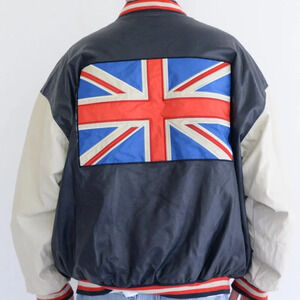 Crafted from a high-quality wool blend, the jacket features a striking navy and cream color scheme. The iconic British flag design adds a unique touch of vintage charm, while the faux leather sleeves and trim provide a stylish contrast and extra durability. The varsity bomber style is enhanced with classic details such as ribbed cuffs, collar, and hem, ensuring a snug and comfortable fit.