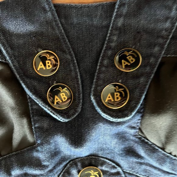 This vintage 90s style Apple Bootoms Jeans bodycon dress has not aged one bit! Its fitted silhouette in denim and black and gold accents give it a sexy appeal. Complete with iconic double apples zipper pull and rivets. Size 5/6, comparable to a XS.