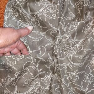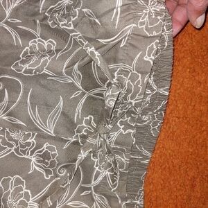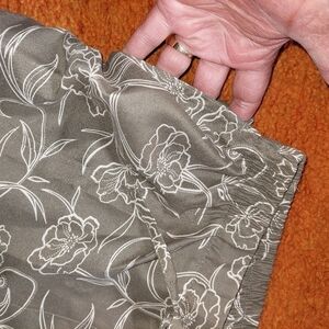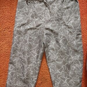 Nice patterned Capri. White floral on gray/green background. 100% polyester. Front drawstring. Elastic back waist. Pull-ups. Side pockets along with thigh pockets. waidt length 19". Alia. (Alia tag had been removed.)