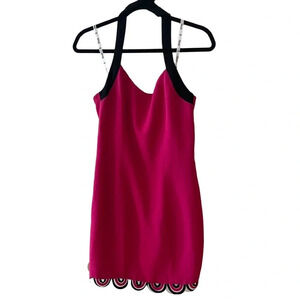 Vintage 90s Barbiecore pink halter mini dress with black strap and scalloped hem.