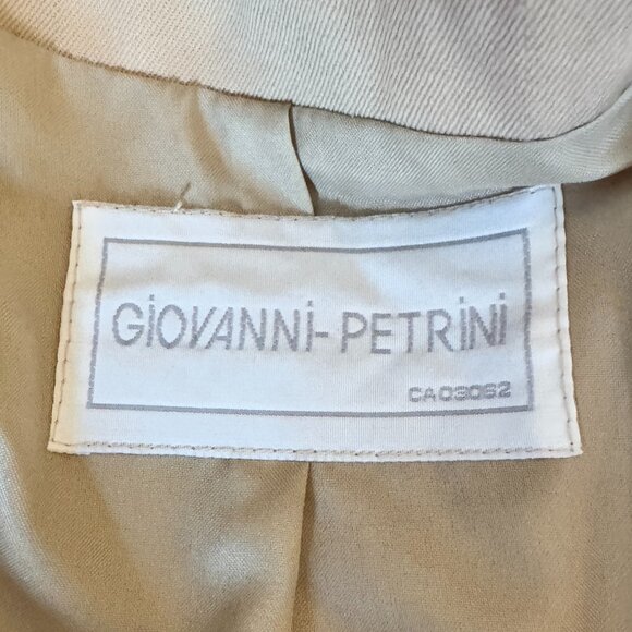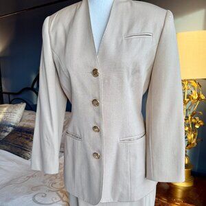 Vintage 1990s beige business skirt suit set with elaborate gold buttons by Giovanni Petrini, size 5/6, fits like a 2-4. Single breasted blazer, elastic at back of skirt waistband, 100% wool, made in Canada. Has a few holes that I have no idea how to repair. One on the back, one just below the back collar, and one on the side of the skirt. Shown in photos 7 & 8. Cat friendly, nonsmoking home.