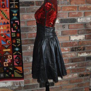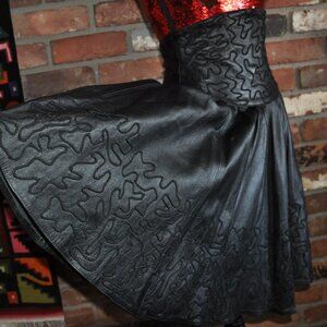 Vintage 90s Black Leather Wide Waist Band Embroidered Midi Circle Skirt W26"