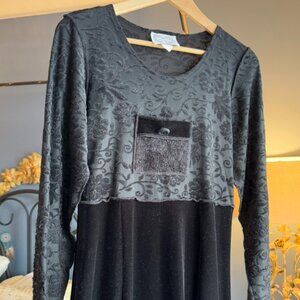 1990s vintage black velvet and lace-type paisley long sleeved maxi dress with pocket at chest, size S from Love Letters Love Notes. Stretchy and very comfy! Bust measures 17.5 inches laying flat, waist 15.5 inches, dress length is 53 inches. Cat friendly, nonsmoking home.