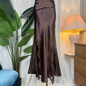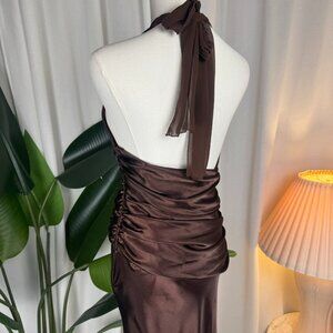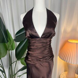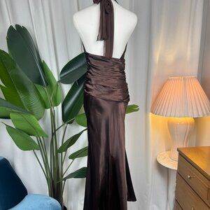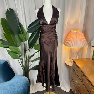 This is a beautiful 1990s halter gown in a rich chocolate brown satin with a plunging halter neckline, ruched bodice, and cascading ruffle hem.