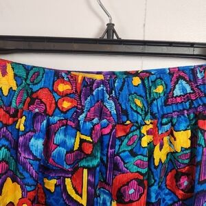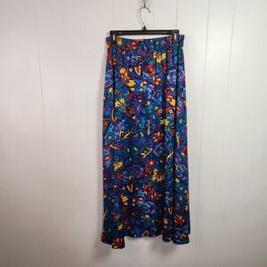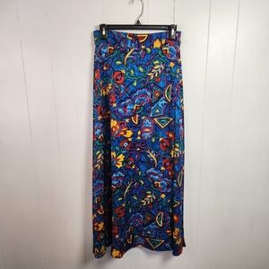 Vintage 90s Blue Funky Print Midi Skirt 1990s High Waisted Summer 100% Silk Sz 8