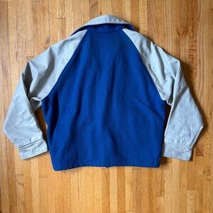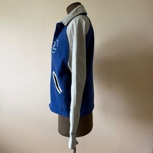 blue, varsity style, leather accents, wool blend, embroidered logo, oversized fit, retro, 90s fashion, college jacket, athleisure
