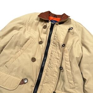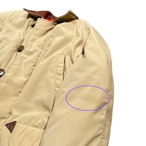 Used in very good condition. NO HOOD. Spot on the left sleeve and cuff. A few small marks from wear. Small bit of wear on the surface of the left elbow. Some minor distressing on the cuffs.