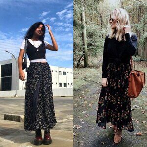 Take it back to the 90s with this beautiful witchy broomstick skirt from Carole Little. This skirt features a maxi length, wide elasticized waistband, flowy cut and beautiful floral border detail. The overall colour is black with shades of gold, pine and dusty rose.