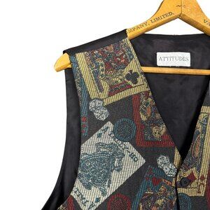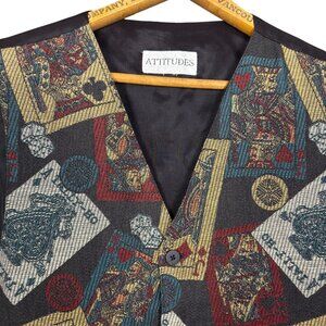 vintage casino vest, 90s tapestry waistcoat, playing card vest, vegas style vest, gambling print vest, vintage men’s vest, retro party vest, card suit waistcoat, poker print vest, statement vintage vest, attitudes brand vest, unisex costume vest, dice and card vest