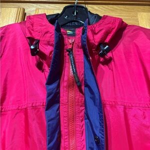 This vibrant red rain jacket is crafted from a Gore-Tex material with a weather-resistant finish, ensuring you stay dry during rainy days. Its sporty design offers both style and functionality, making it a perfect choice for outdoor adventures. The coat's striking color and sleek finish add a touch of flair to any rainy day ensemble. Storm flaps on the zipper and a storm hood. Originally came with a zip in liner for colder weather but that has been lost and is not included. Has interior drawstring to cinch waist.