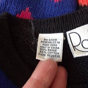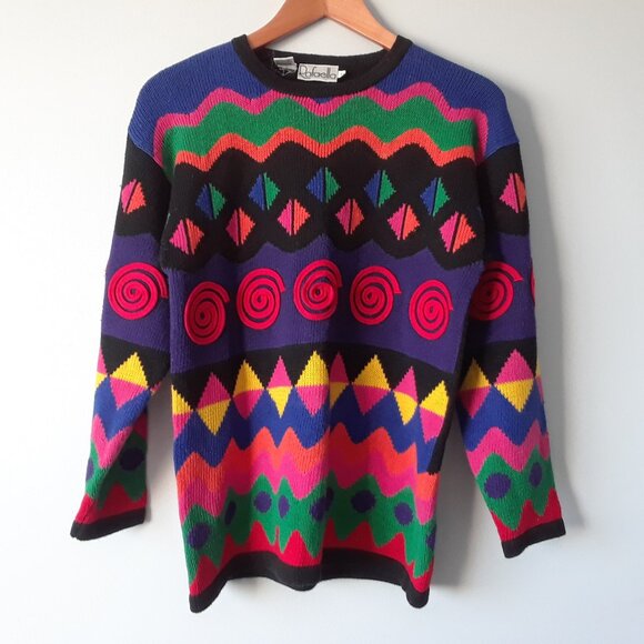 Stunning and unique vintage 90s sweater by Rafaella. Made of a natural blend of soft Ramie and Cotton, and featuring a bright abstract design for a pop of color in your outfit.