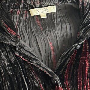 Channel peak 90s and early Y2K glam with this dramatic crushed velvet blouse in deep black and red wine tones. With its ruched silhouette and dreamy, gothic sheen, this top is the definition of whimsigoth elegance romantic, mysterious, and ready to turn heads. Whether you're dressing it up for a night out or layering it over a mesh tee, this vintage piece offers rich texture and unmistakable vibe.