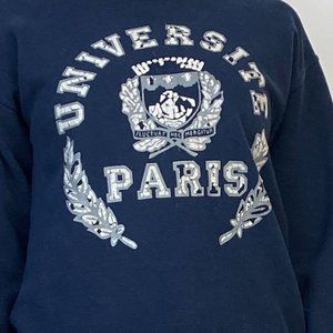 Super cute navy sweatshirt with crumbly/distressed university of Paris graphic! Not super old but has a good vintage look! Gildan Heavy Blend tag, made in Honduras. Size small.