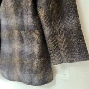 Elevate your wardrobe with this stunning vintage blazer by Daniel Hechter, expertly crafted in Canada. Features a rich brown plaid wool blend with a luxe camel suede collar and a full burgundy acetate lining. Two-button front closure, front patch pockets, and classic tailoring make this a timeless fall/winter staple.