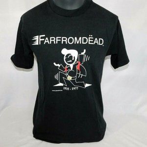 This vintage 90s Farfrom Dead Elvis Funny Mens Medium T Shirt FARFROMDEAD stick figure Elvis is in Overall good clean vintage condition some uniform fading from age and wash ** Note there is a lighter faded area on back right shoulder and there are 2 small holes on back hem. Shirt is 100% cotton - Machine washable. Shirt measurements laying flat are: