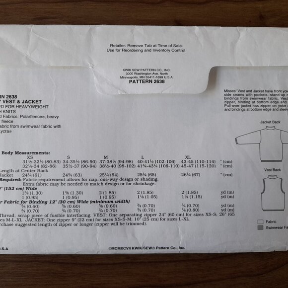 Vintage 90s Fleece Vest Jacket Sewing Pattern Size XS-XL Kwik Sew 2638 UNCUT