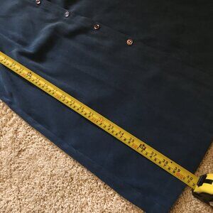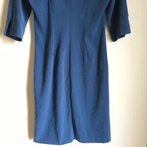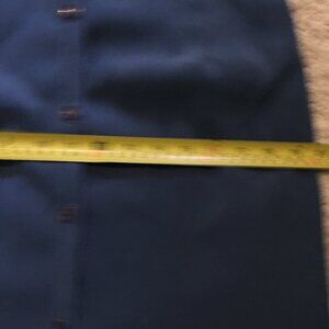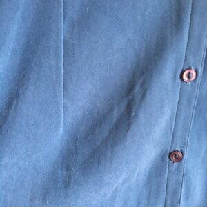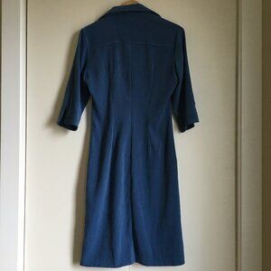 Very good preowned vintage condition long, blue faux suede, button down dress by Garage. This is a vintage piece made in Canada. Great quality. They don't make bold cuts and fits like this anymore. They are more likely to tailor it straight and add a fabric belt. Nice details, darting, etc.