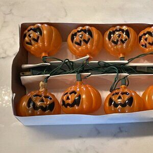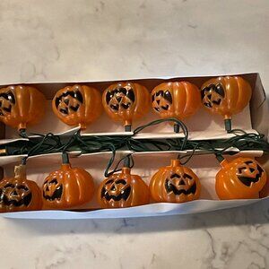 Vintage 90s Halloween 10 Light String Pumpkin Blow Mold Set with Box - 9 ft long
