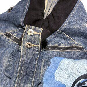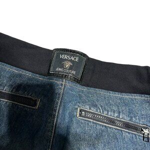 These jeans totally bring me back to my rave days in the UK. Wide cut fit with elastic waist and zipper pockets with orange mesh lining at the knees. Blue hand painted face on the left thigh that's giving me Andy Wharhol David Bowie vibes. Zippered hand pockets and on the back. Elastic cotton waist for the perfect low cut. Versace Couture patch on the back, it's soooooo 90's rave lol!
