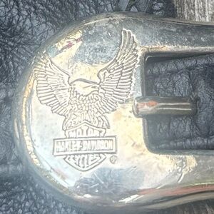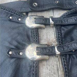Amazing 90’s Harley Black Leather Chaps for riding. Official Harley Product. Waist belt can adjust from size 34 to 36 waist with a 31 inch inseam.